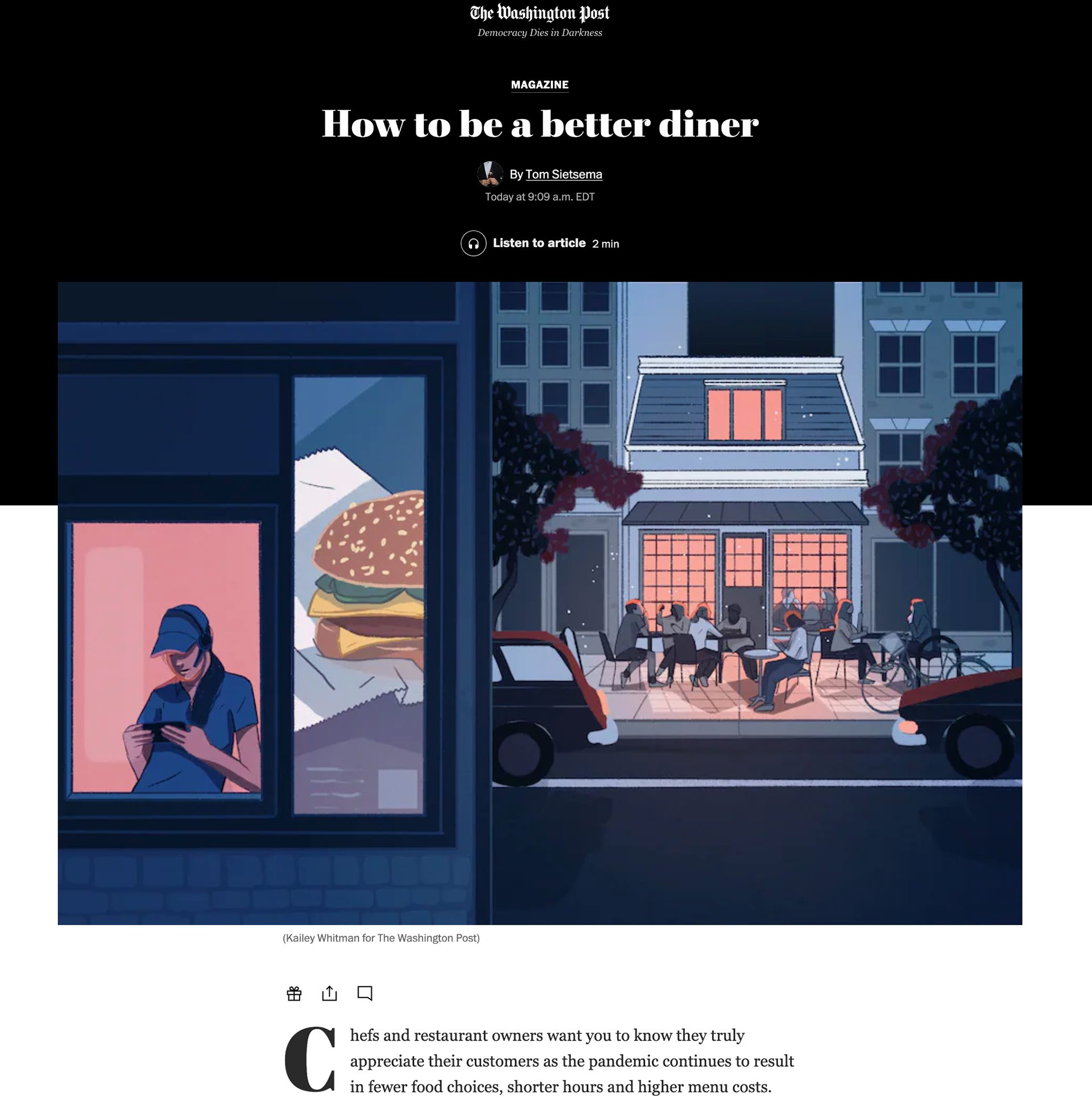 washington post magazine // a post-covid guide to making better choices as a diner. AD Clare Ramirez